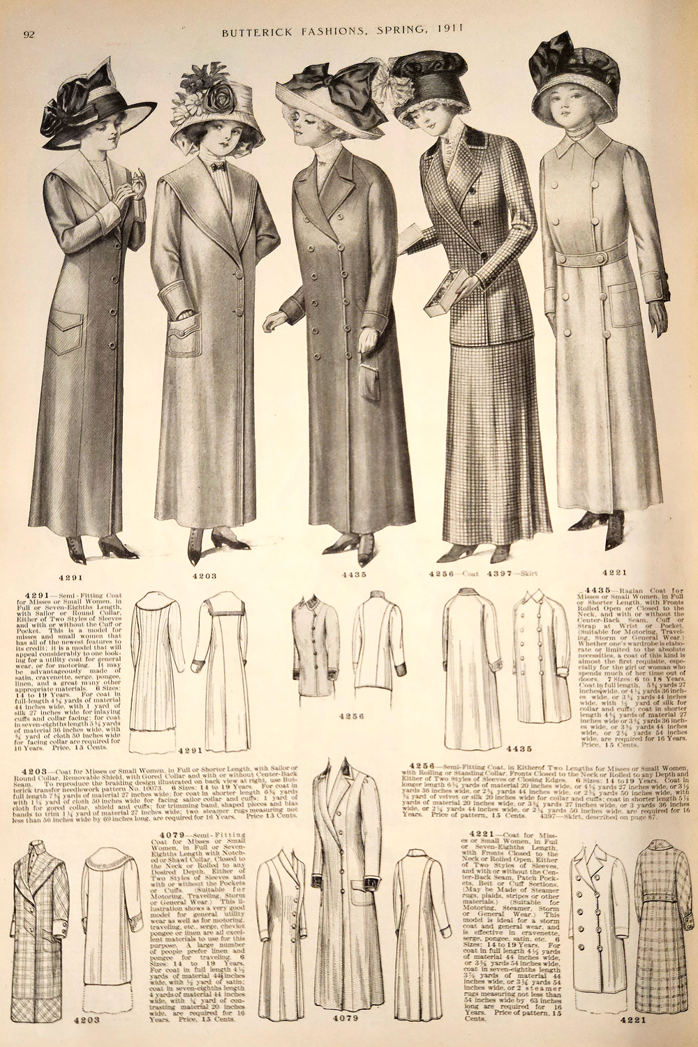 Butterick’s grading system was adapted for women and girls sewing patterns. The “collection” was available in 13 sizes for dresses, coats, and blouses including 5 sizes for skirts.